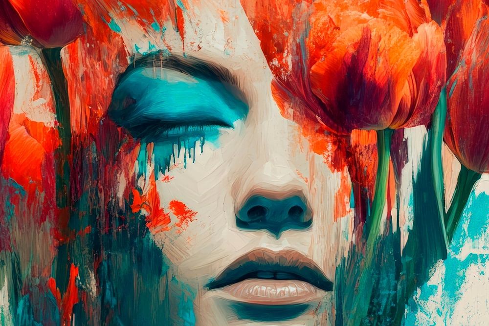 In a fascinating interplay of vibrant colours, orange tulips blossom and frame a dreamy, soulful face. The artistic fusion of floral and human elements creates an atmosphere of calm and inspiration, perfect for a creative office or a harmonious living room where art and emotion meet.