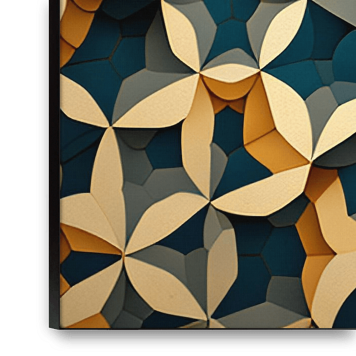 This elegant artwork features a seamless blend of geometric patterns and floral motifs arranged in a balanced, symmetrical composition. A colour palette of soft blues, warm greys and golden yellows creates an inviting and sophisticated visual experience. The floral-inspired shapes add a natural touch to the textured design and are…
