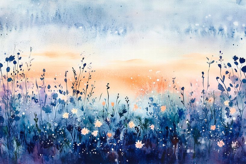A gentle colour gradient of blue and orange envelops a blooming meadow full of delicate flowers in full bloom. This vibrant watercolour brings a calm, relaxing atmosphere to any room. Perfect for the bedroom or living room, it offers a touch of nature and freshness that will brighten up any day.