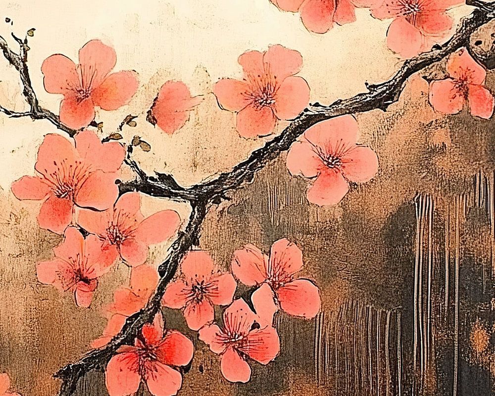 Blossom Gold | Blossom Veins - This floral painting shows an elegant branch with vibrant pink blossoms bursting out against a softly saturated gold-brown background with subtle vertical textural stripes.