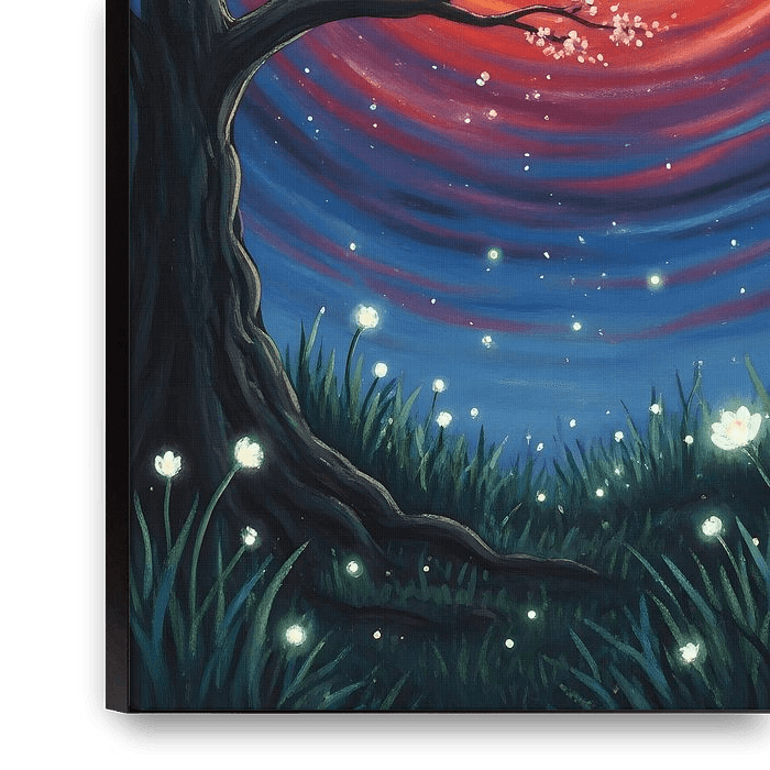 A dreamy artwork featuring a blossoming tree reaching into a radiant cosmic swirl of warm sunset tones. The scene blends nature and fantasy, with delicate pink cherry blossoms contrasted against a glowing orange and red spiral sky, fading into deep midnight blue scattered with stars and glowing flowers in the grass. Perfect for lovers…