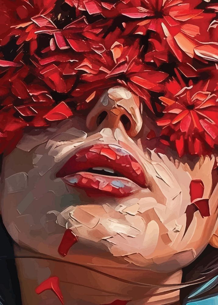 A woman's face is veiled by a cascade of vibrant red flowers, her expression both serene and enigmatic. The contrast between the soft, delicate petals and the strong, determined jawline creates a captivating visual.
