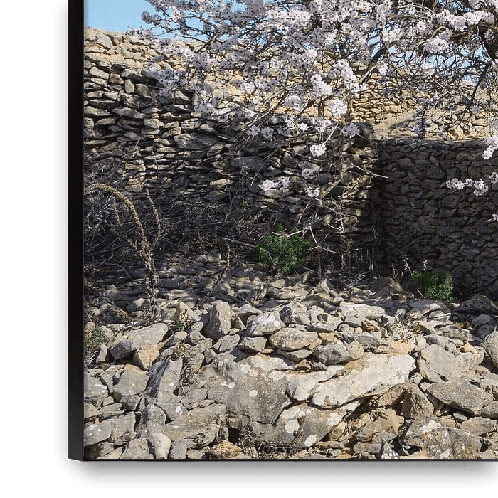 Buy this flower art Blossoming almond tree and traditional farmhouse in Spain by Adriana Mueller on canvas, ArtFrame, poster and wallpaper, printed on demand in high quality.
