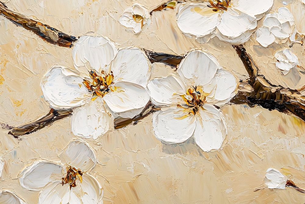 This design brings the beauty of nature into your home with its beautiful depiction of blossoming flower branches. The soft, soothing colours of white, cream and beige are enhanced by subtle gold accents, creating a sophisticated look. The thick paint strokes give the work a dynamic and textural feel, making the flowers seem to pop out of the canvas. This painting adds a touch of elegance to any room and fits perfectly in interiors that want to exude calm, serenity and a natural atmosphere. It is a timeless decoration that fits both modern and classic styles, ideal for a living room, hallway or even a bedroom.