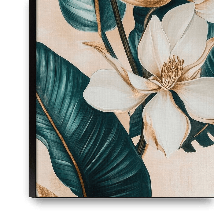 Delicate, bright white flowers unfurl majestically between lush, deep green leaves. Their golden accents lend the composition a touch of elegance and luxury. The gentle contrast between flowers and foliage creates a harmonious balance that transports the viewer to a subtropical oasis. A masterpiece of nature, captured in a breathtaking…