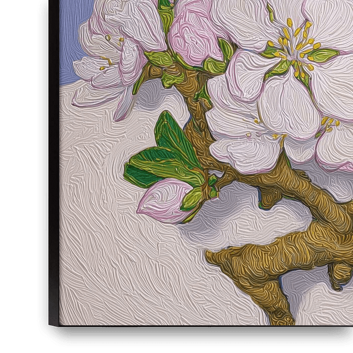 This artwork depicts a blossoming branch full of soft pink and white flowers that stand out beautifully against a tranquil blue-purple background. The distinct brushwork gives the work a lively, almost tangible appearance and emphasises the shape of each petal.