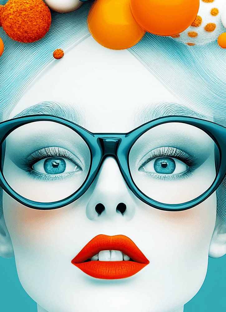 This fascinating portrait of an eyeglass-wearing woman is a true work of art that enriches any interior. The light blue, almost azure background is a beautiful contrast to the orange details, giving the artwork a dynamic and vibrant look.
