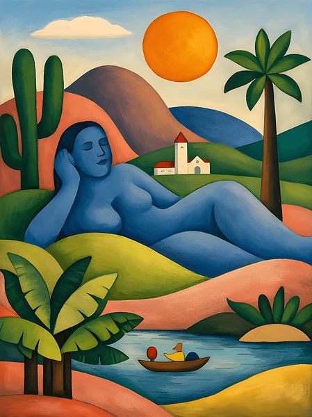 A reclining blue figure becomes one with rolling hills and tropical vegetation, blurring the boundary between body and land. The warm sun and soft curves create a tranquil, almost mythic atmosphere, celebrating nature as both shelter and identity.