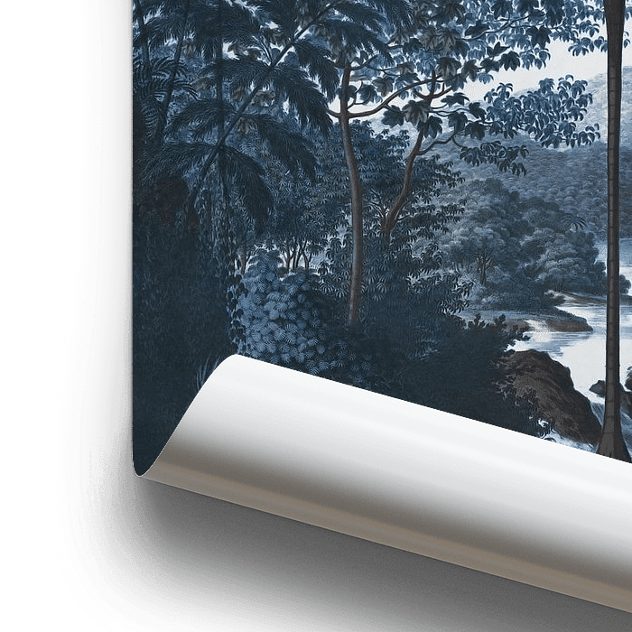 Historical landscape illustration of exotic paradise scenery with tropical plants, mountains and water, immersed in soft blue light.