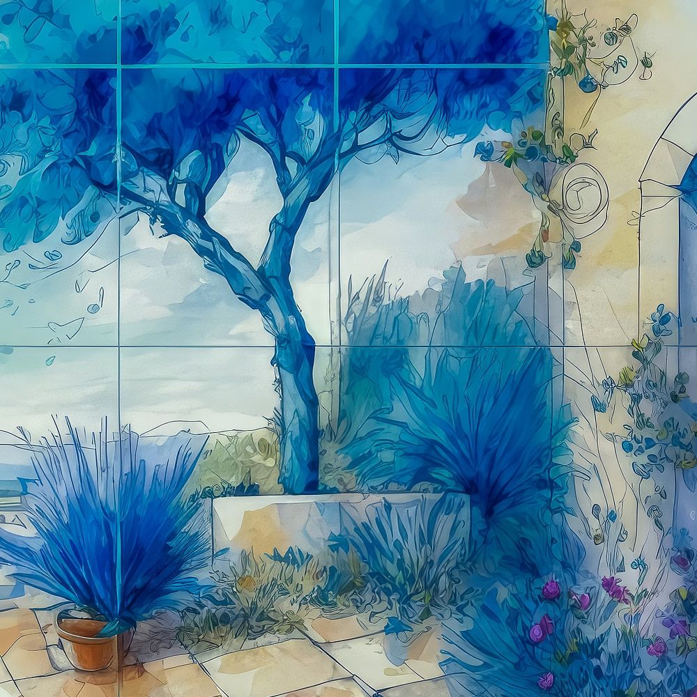 A rural watercolour painting of a characteristic house set in a flower garden near the Mediterranean Sea. The traditional southern French house is surrounded by flowers, plants and a characteristic tree in azure blue. In the background, the sea and horizon. The watercolour technique gives the image a lively and atmospheric look.