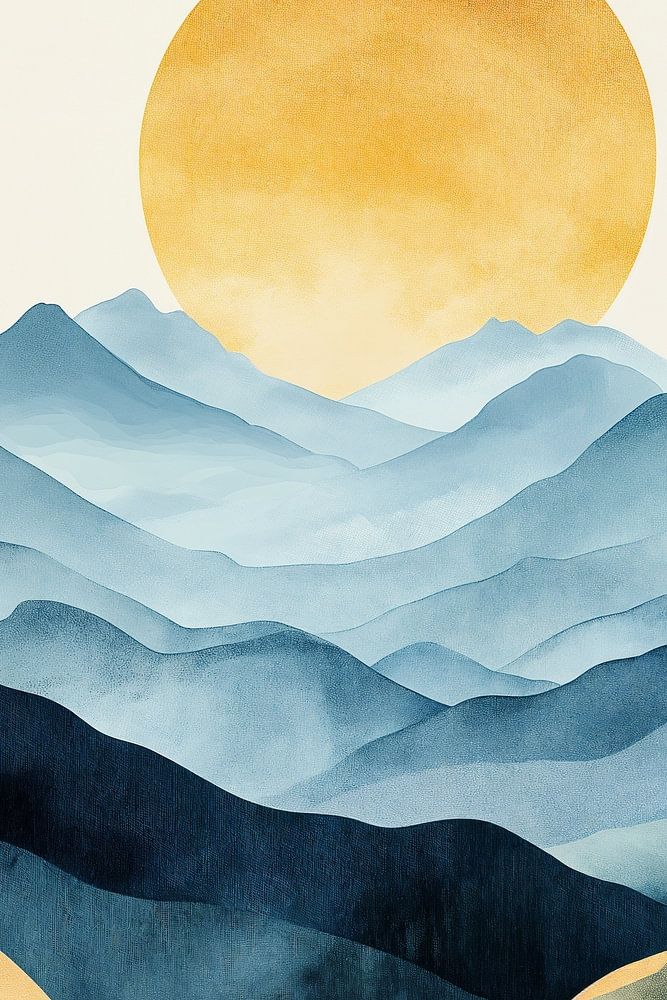This abstract landscape shows serene mountain contours and a powerful sunrise. Blue mountains contrast with a golden sun, while misty layers create depth. The work balances between realism and abstraction, and captures the essence of a mountain landscape: tranquility, grandeur and natural cycles. Watercolor-like textures enhance the dreamy atmosphere, inviting contemplation of the serene mountain beauty at dawn.