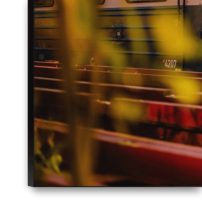 Blue railcar framed by red rails and soft leaf bokeh in warm evening light. Atmospheric railway print for homes, cafés, studios and offices.