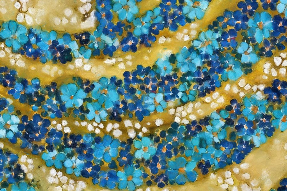 A wave of petals moves rhythmically across a golden ground. The work resembles a field of forget-me-nots, but seen from the air-an abstract pattern that feels both natural and graphic. Shades of blue, ranging from deep cobalt to bright turquoise, are interspersed with accents of white and tiny dots of orange in the flower hearts.