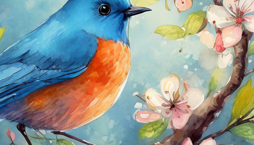 Buy this painting Blue bird on a branch in spring, art design by Animaflora PicsStock as a reproduction on canvas, ArtFrame, poster and wallpaper, printed on demand in high quality.