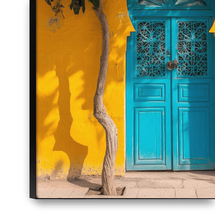 A radiant ensemble of bright yellow and calming blue transports you to a world full of colour. The lush, yellow blossom of the tree crowns the brightly coloured façade, while the artistically designed door with its filigree details is inviting. Together, they create a harmonious symphony of nature and architecture that enchants the…
