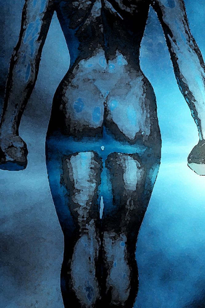Buy this digital art artwork Blue fantasy work of a woman full of inner strength. Resurrection by Cor Heijnen as a reproduction on canvas, ArtFrame, poster and wallpaper, printed on demand in high quality.