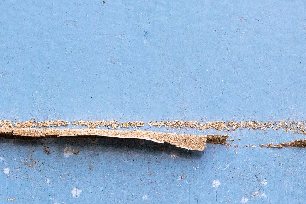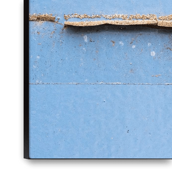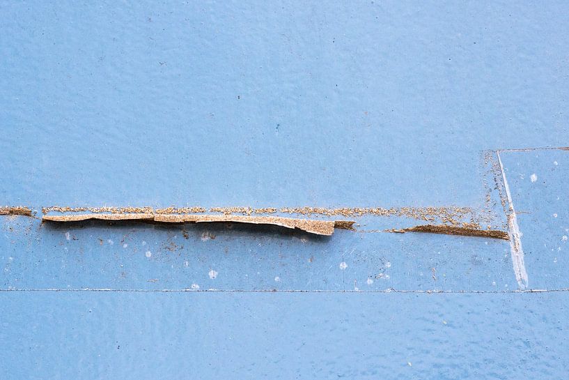 This abstract art photograph shows a horizontal line of flaking material against a soft blue background. The composition evokes the image of a tranquil landscape: a horizon that stands out sharply between sky and earth, or water and coast. Small grains, cracks and irregularities give the surface a tactile quality and suggest traces of…