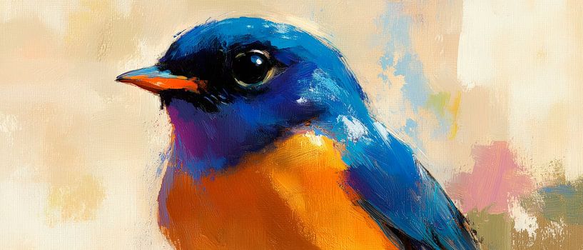 A bright blue bird with warm orange tones radiates cheerfulness and liveliness. Its large, glowing eyes immediately attract attention and give the artwork a charming aura. Ideal for the living room, this picture brings a breath of fresh air and a sense of connection with nature to any room.