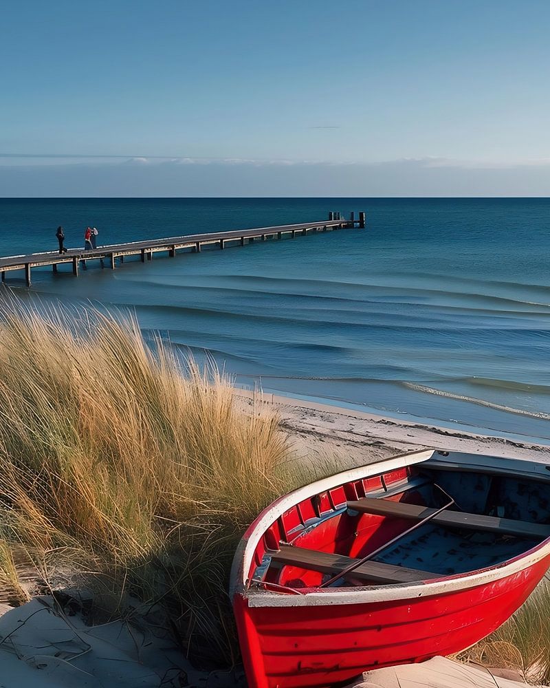 Buy this landscape artwork Blue sea, small boat by Arndt-Christoph Föcks on canvas, ArtFrame, poster and wallpaper, printed on demand in high quality.