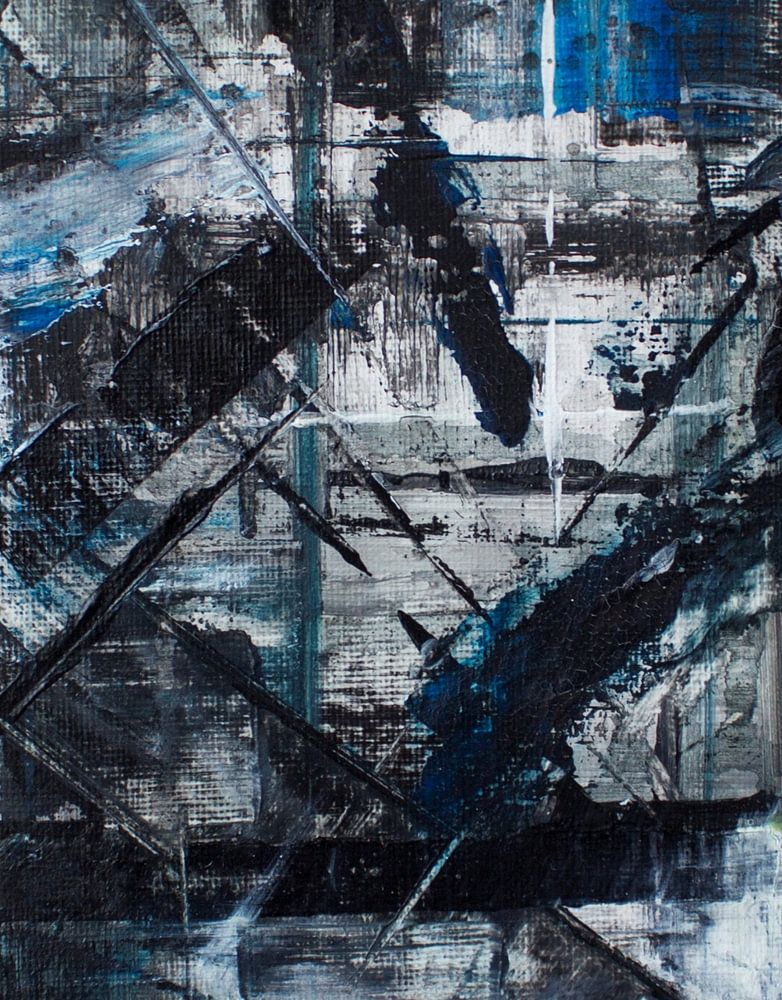 This artwork has a somewhat cool, raw vibe thanks to the use of blue, black and white. It almost feels like a nocturnal cityscape, but rendered entirely in an abstract style. The various shades of blue lend the work a sense of depth and mystery, whilst the black areas and lines provide a solid foundation. The white breaks this up and…