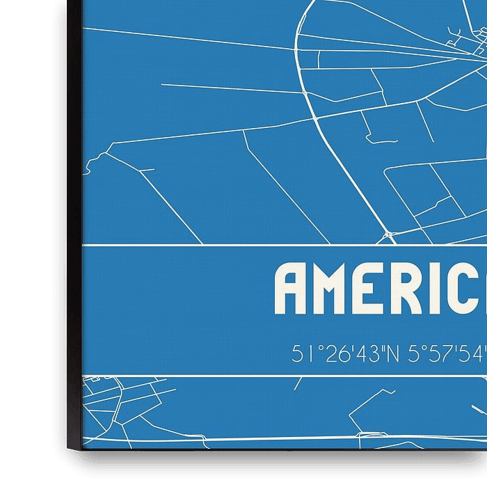 Blueprint of the map / map of the Dutch town of America, located in municipality of Horst aan de Maas, province of Limburg. The map includes all public roads and the coordinates of the center of America.