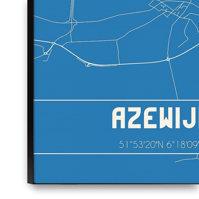 Blueprint of the map / map of the Dutch town Azewijn, located in the Liemers, in municipality Montferland, Gelderland province. The map contains all public roads and the coordinates of the center of Azewijn.