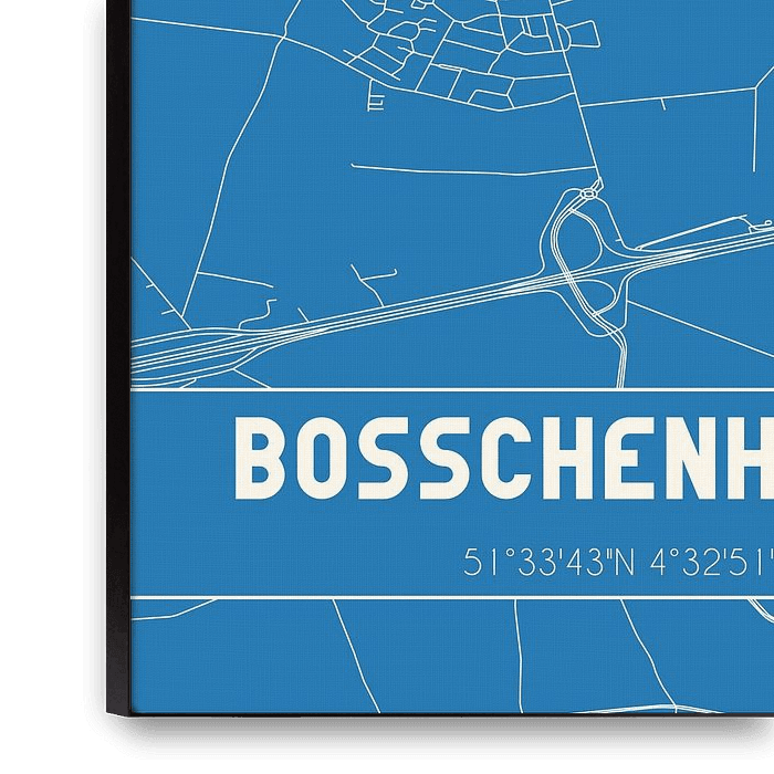 Blueprint of the map / map of the Dutch town Bosschenhoofd, located in municipality Halderberge, province of North Brabant. The map contains all public roads and the coordinates of the center of Bosschenhoofd.