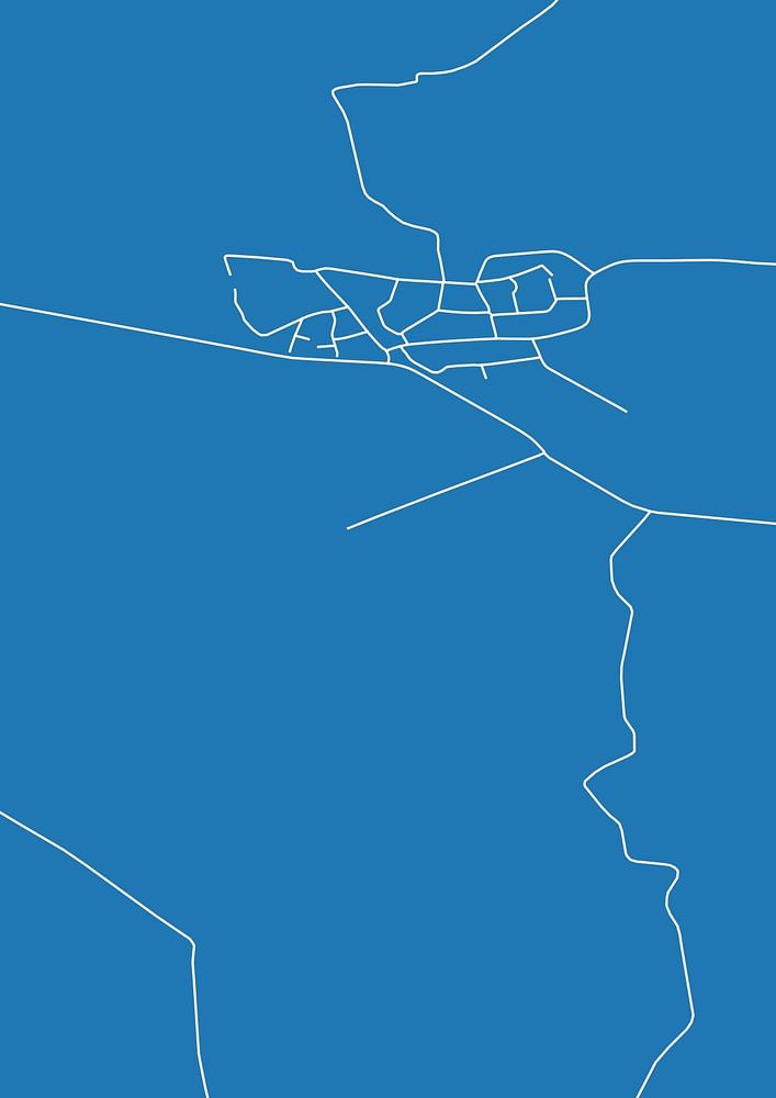 Blueprint of the map / map of the Dutch town of Ezinge, located in municipality Westerkwartier, province of Groningen. The map contains all public roads and the coordinates of the center of Ezinge.