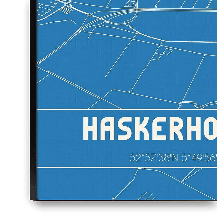 Blueprint of the map / map of the Dutch town Haskerhorne, located in municipality De Fryske Marren, province Fryslan. The map contains all public roads and the coordinates of the center of Haskerhorne.