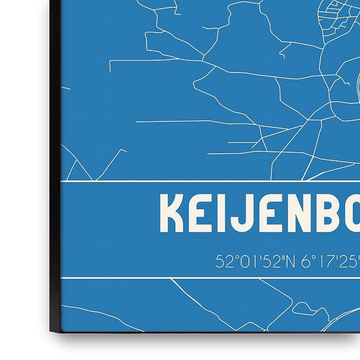 Blueprint of the map / map of the Dutch town of Keijenborg, located in the Achterhoek, in municipality of Bronckhorst, province of Gelderland. The map contains all public roads and the coordinates of the center of Keijenborg.