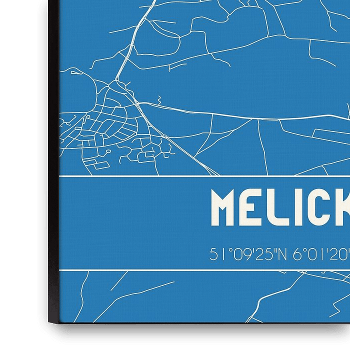 Blueprint of the map / map of the Dutch town of Melick, located in municipality of Roerdalen, province of Limburg. The map contains all public roads and the coordinates of the center of Melick.