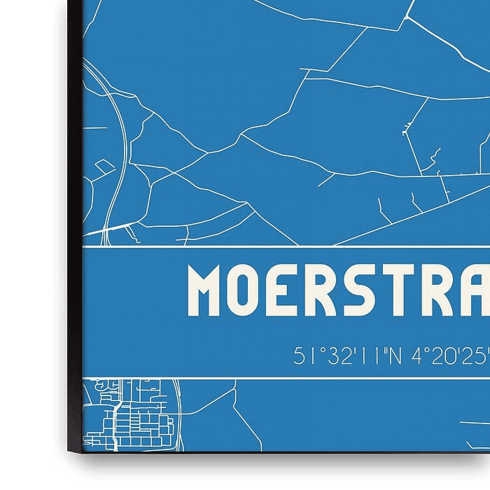 Blueprint of the map / map of the Dutch town of Moerstraten, located in municipality of Roosendaal, province of North Brabant. The map contains all public roads and the coordinates of the center of Moerstraten.
