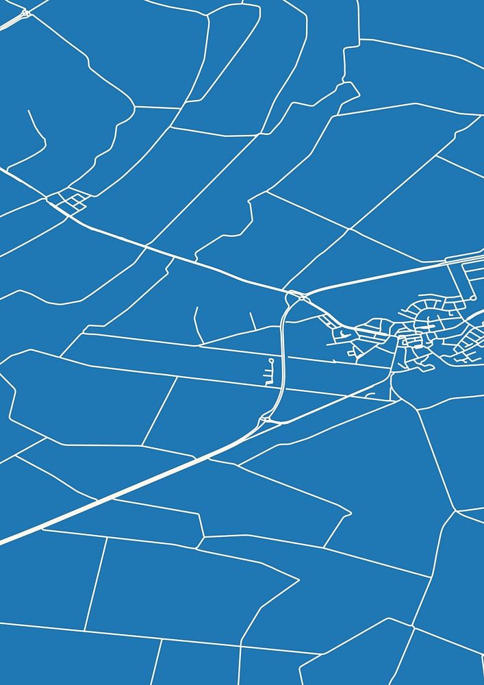 Blueprint of the map / map of the Dutch town Oostburg, located in municipality Sluis, province of Zeeland. The map contains all public roads and the coordinates of the center of Oostburg.