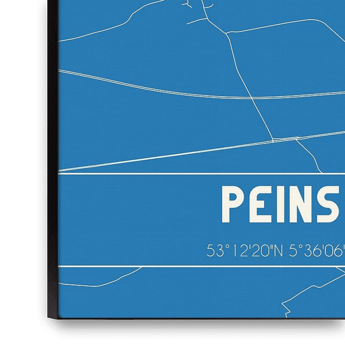 Blueprint of the map / map of the Dutch town of Peins, located in municipality of Waadhoeke, province of Fryslan. The map includes all public roads and the coordinates of the center of Peins.