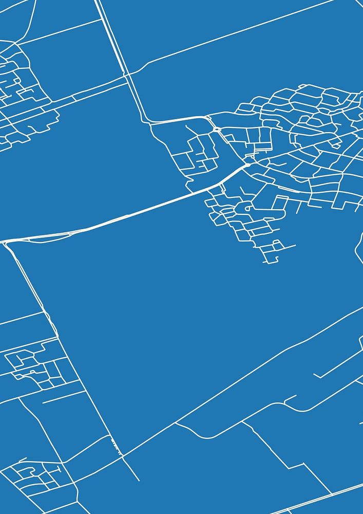 Blueprint of the map / map of the Dutch town Surhuisterveen, located in municipality Achtkarspelen, province Fryslan. The map contains all public roads and the coordinates of the center of Surhuisterveen.