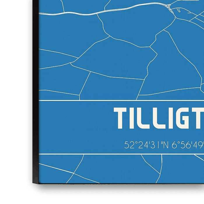 Blueprint of the map / map of the Dutch town Tilligte, located in Twente, in municipality Dinkelland, province of Overijssel. The map contains all public roads and the coordinates of the center of Tilligte.