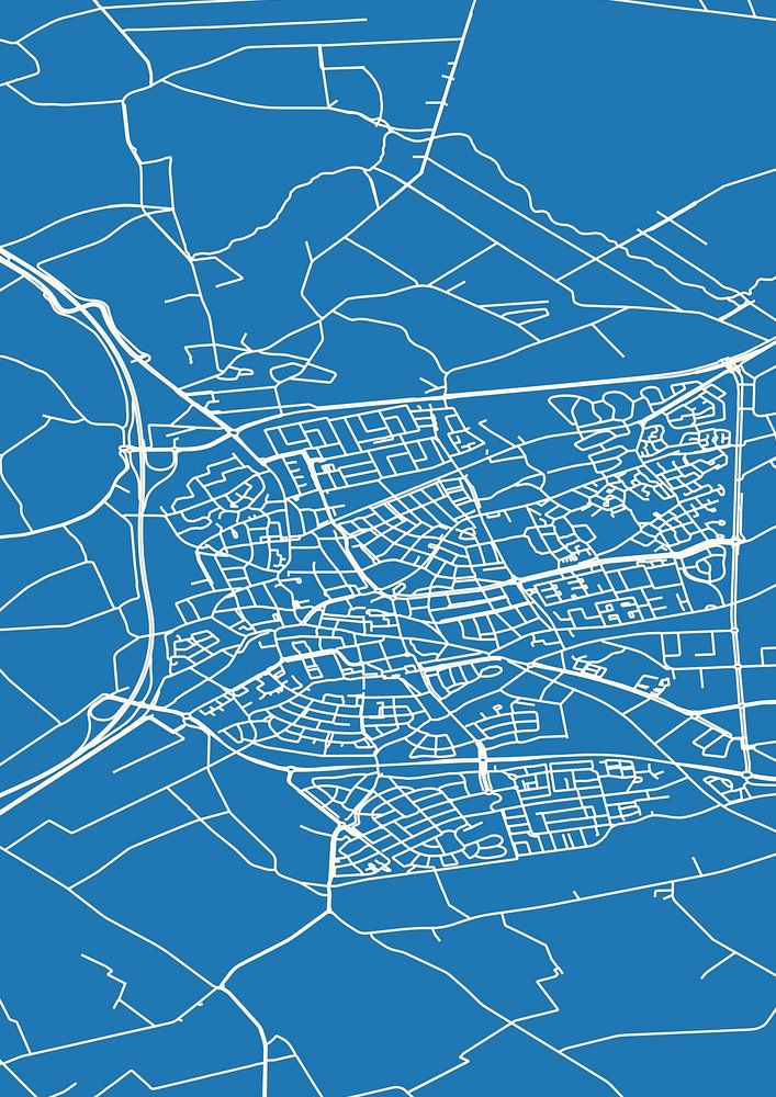Blueprint of the map / map of the Dutch town of Uden, located in municipality of Uden, province of North Brabant. The map includes all public roads and the coordinates of the center of Uden.