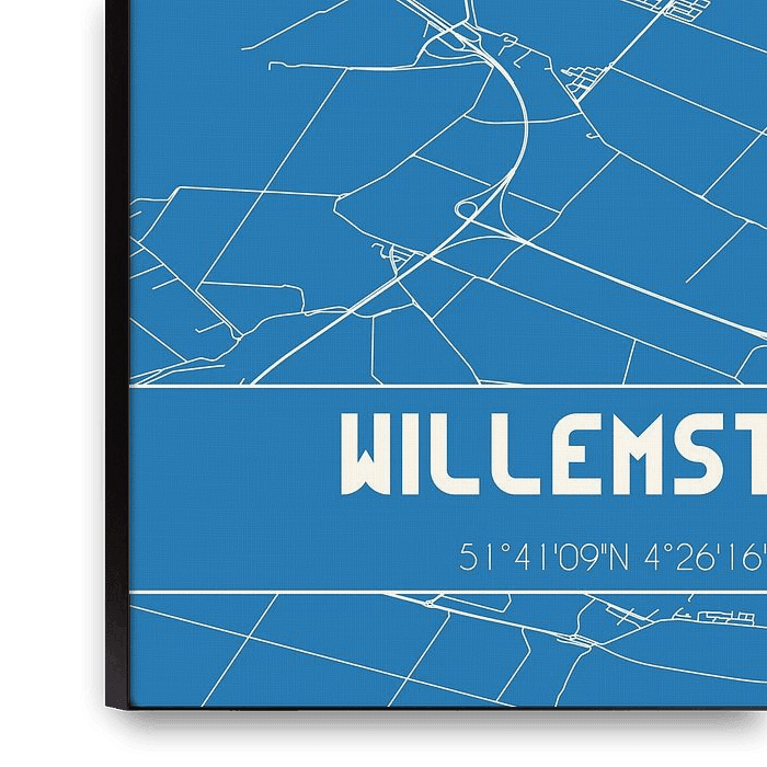 Blueprint of the map / map of the Dutch town Willemstad, located in municipality Moerdijk, province of North Brabant. The map includes all public roads and the coordinates of the center of Willemstad.