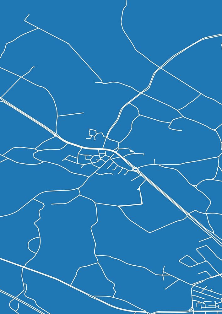 Blueprint of the map / map of the Dutch town Zenderen, located in Twente, in municipality Borne, province of Overijssel. The map contains all public roads and the coordinates of the center of Zenderen.