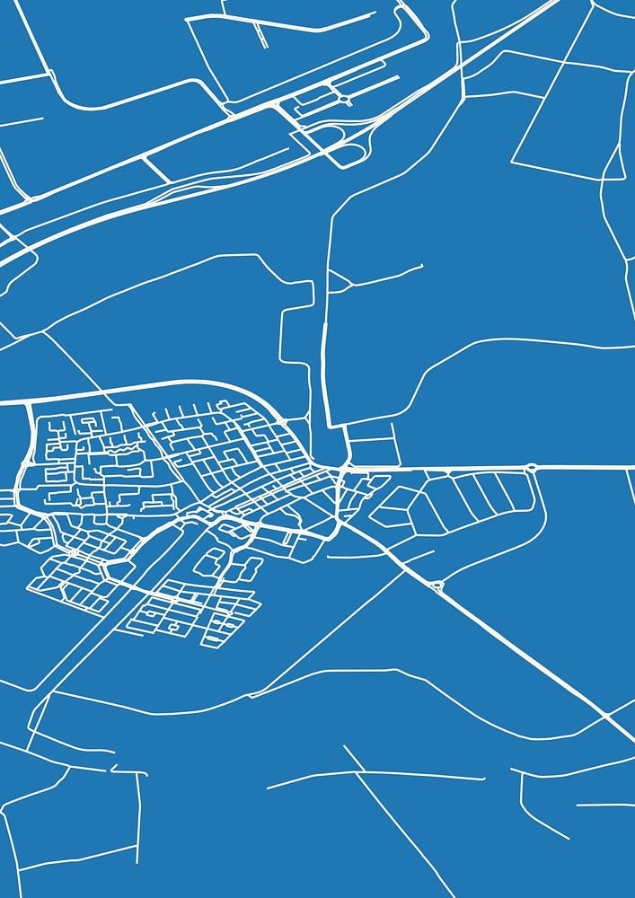 Blueprint of the map / map of the Dutch town of Zevenbergen, located in municipality of Moerdijk, province of North Brabant. The map contains all public roads and the coordinates of the center of Zevenbergen.
