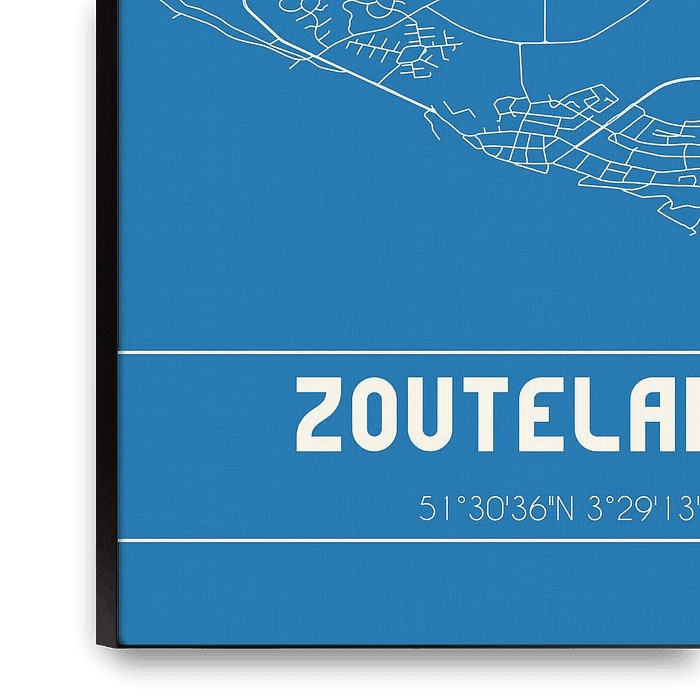 Blueprint of the map / map of the Dutch town Zoutelande, located in municipality of Veere, province of Zeeland. The map contains all public roads and the coordinates of the center of Zoutelande.