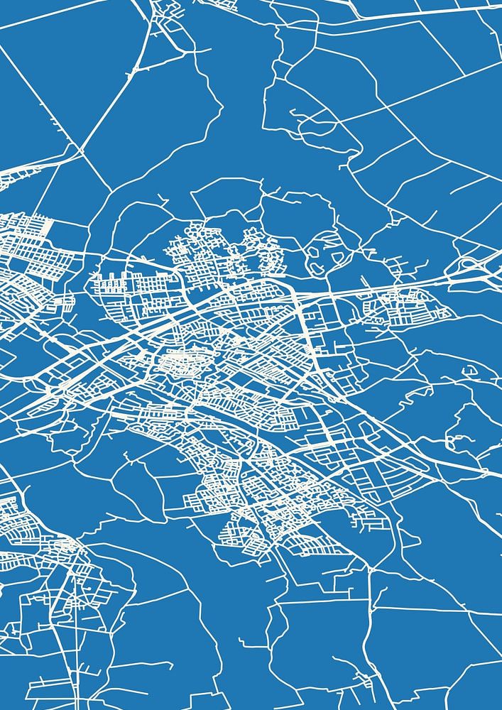 Blueprint of the map / map of the Dutch town Zwolle, located in municipality Zwolle, province of Overijssel. The map includes all public roads and the coordinates of the center of Zwolle.
