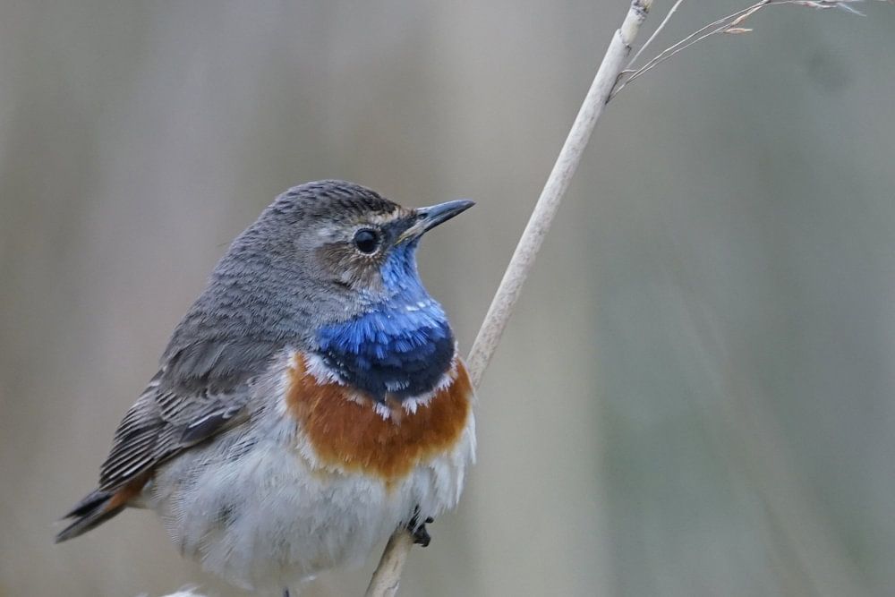 Bluethroat on a reed. Nature photo of bird. Bokeh