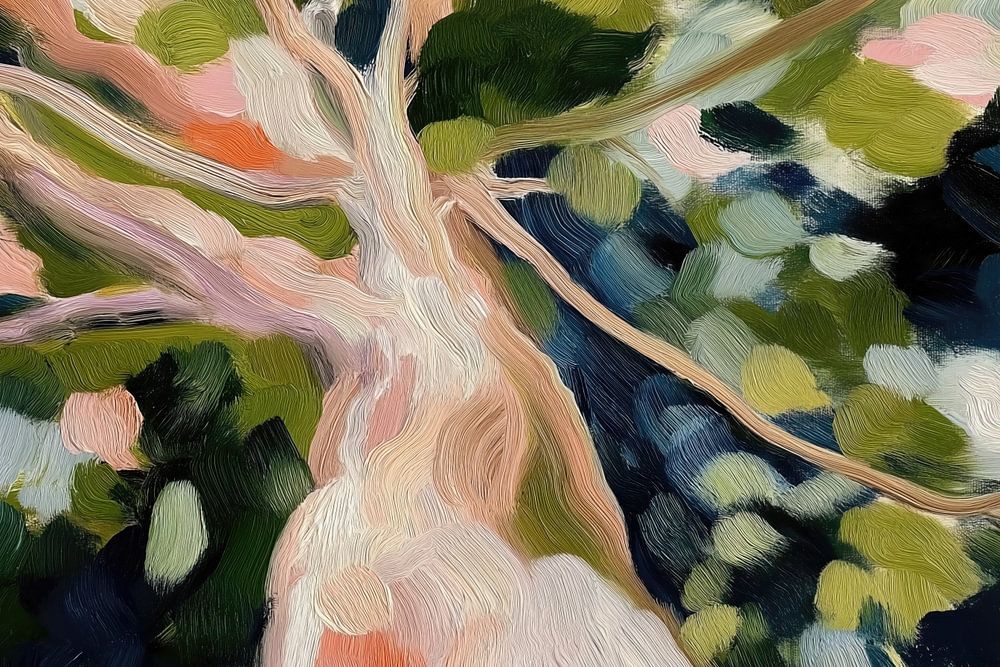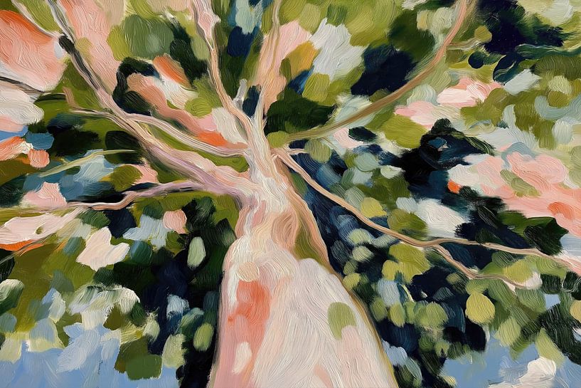 An impressionistic upward view of a tree canopy, where soft blush tones and layered greens blend in textured brushstrokes, capturing the gentle movement of leaves against a luminous sky