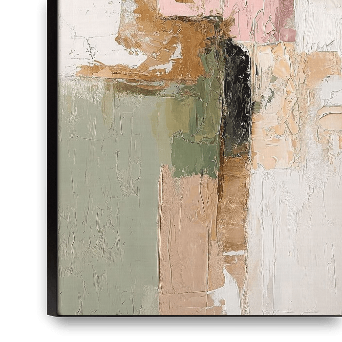 A soothing abstract artwork in which soft pink tones blend harmoniously with subtle green and beige accents. The textured brushstrokes create an organic composition with a calm, almost meditative quality. The various color planes are delicately interwoven, resulting in an atmospheric whole that fits perfectly into a modern interior.