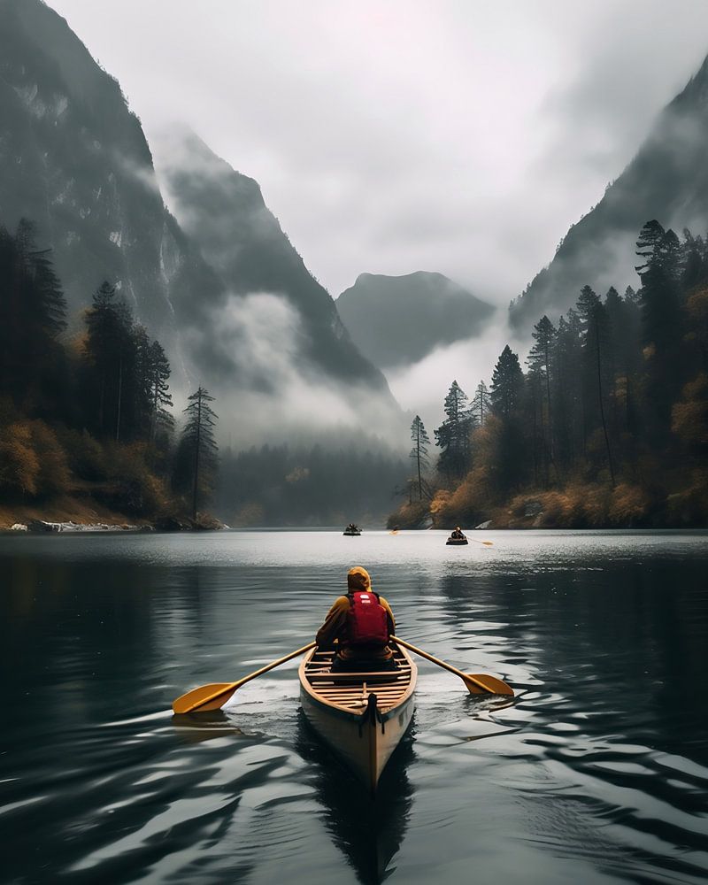 Buy this landscape artwork Boat on the mountain lake by fernlichtsicht on canvas, ArtFrame, poster and wallpaper, printed on demand in high quality.