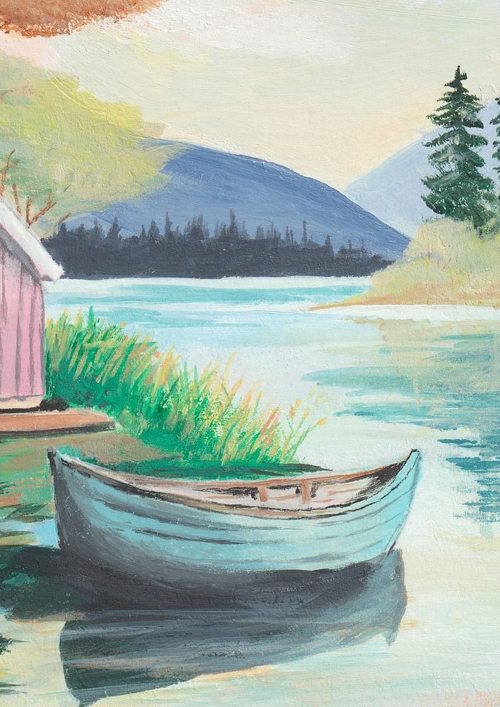A pink boathouse by the water, with a boat gently floating in a dreamy setting - this work brings instant calm and softness to your interior. The landscape is painted with acrylic paint in soft pastel colours, which together evoke a calm, warm atmosphere. Of particular note are the visible brush strokes and paint textures that give the print a tangible, almost tangible quality. If you look closely, you can see subtle details such as the reflection of the boathouse in the water and the small waves around the boat - elements that give the work extra depth.