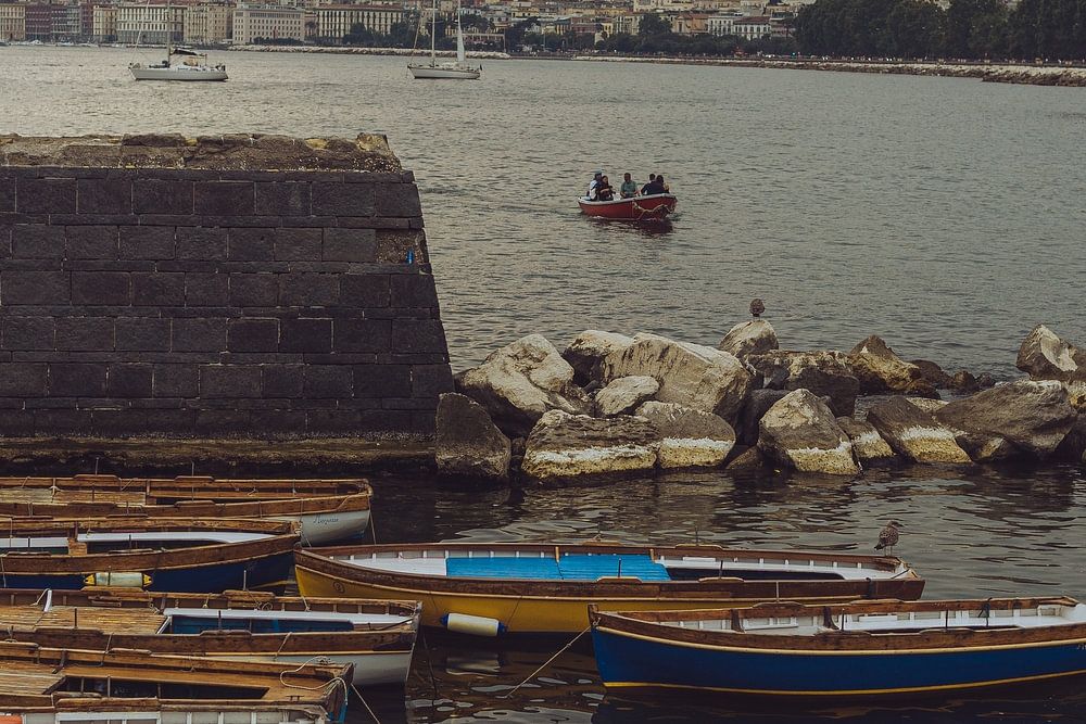 In the background, not only can we taste the bustle of the city of Naples, but we can also see more modern sailing yachts and a dinghy in the water.