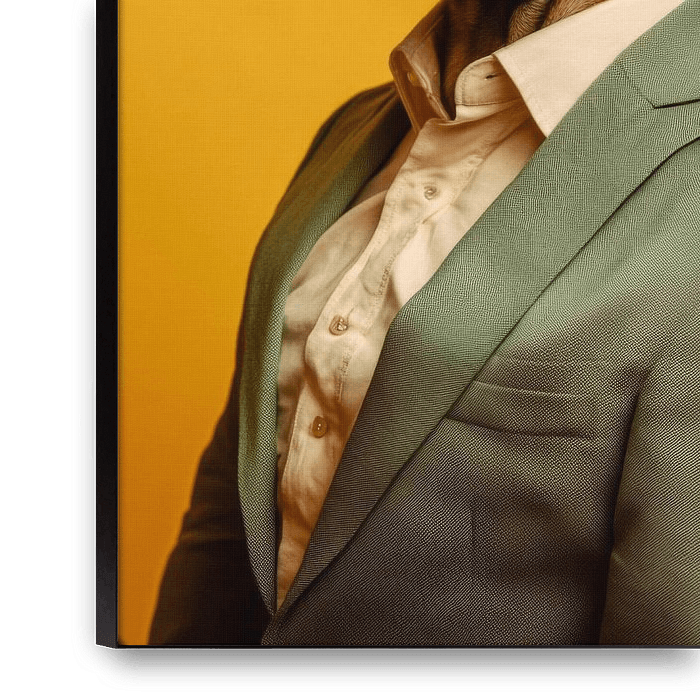 A majestic Boerboel whose imposing appearance and muscular build are shown off to their best advantage in an elegant suit. His alert, relaxed gaze and striking, broad muzzle radiate both strength and intelligence. This unique blend of elegance and strength is perfectly staged against the bright yellow background.