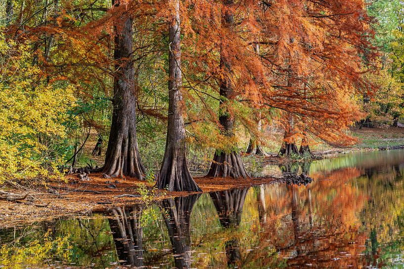 Six stately Swamp Cypress trees in their red-brown autumn hues reflect vainly in the water of a small lake in Tilburg's rambling forest. These unusual trees have characteristic folds at the base of the trunk and above-ground protruding respiratory roots near them....
